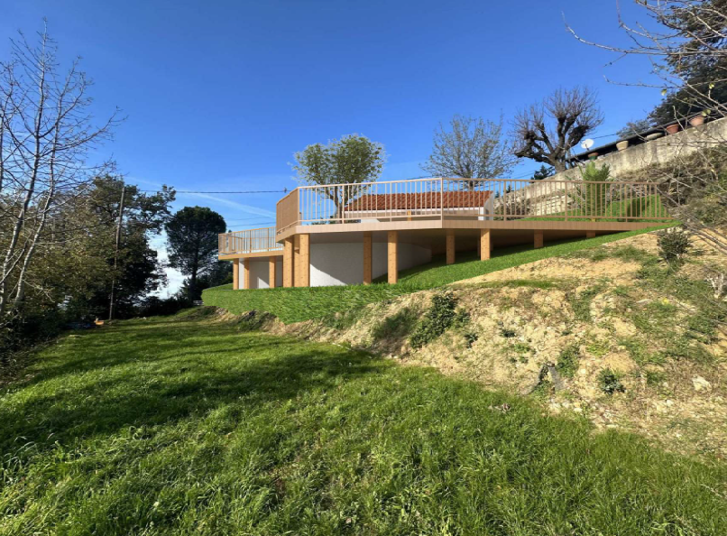 Permis de construire pour une piscine avec terrasse sur pilotis, implantée sur un terrain à fort dénivelé.